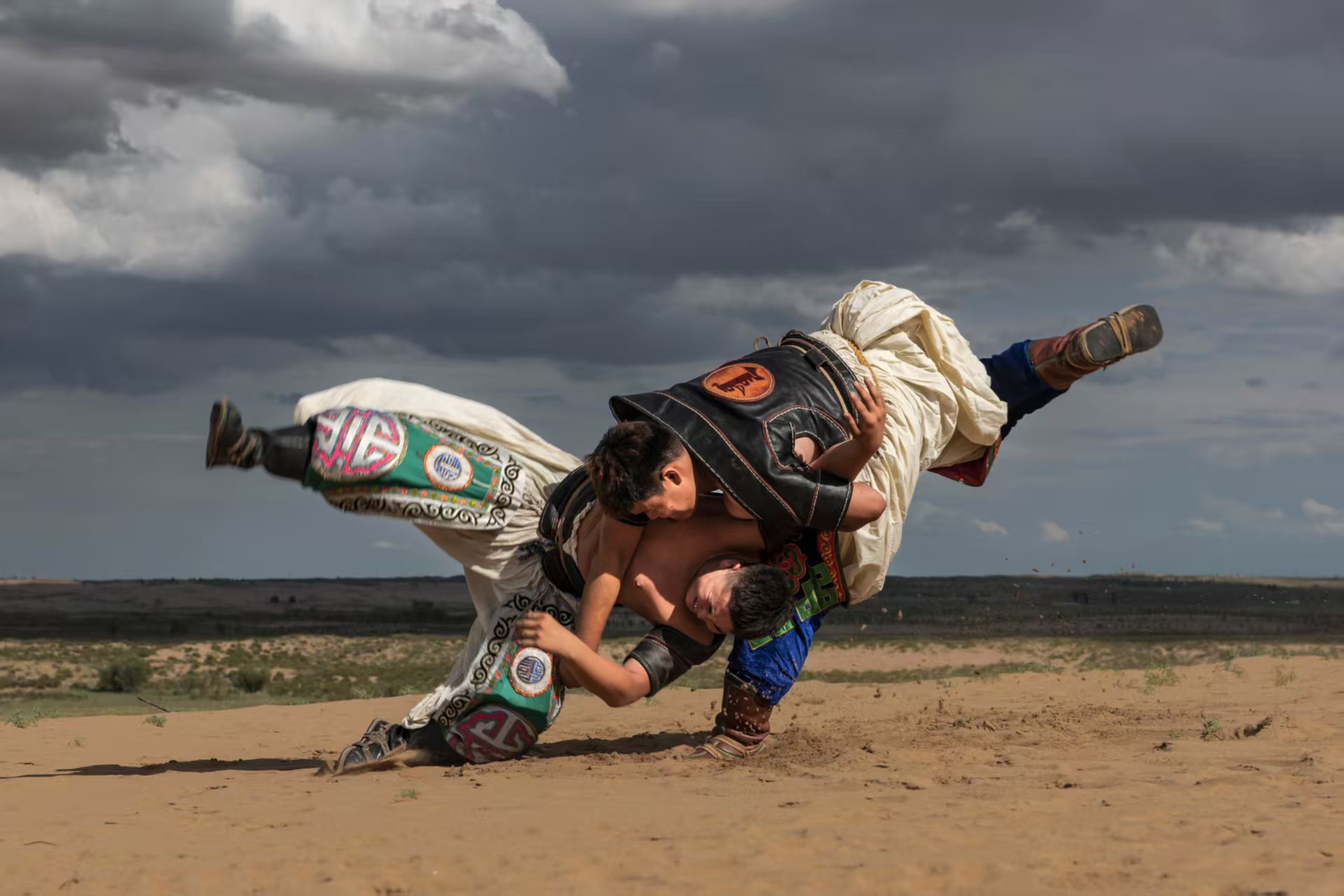 《力拔山兮》2021年7月摄于内蒙古鄂尔多斯鄂托克旗乌兰镇沙日布日旅游区 搏克是蒙古族牧民喜爱的民族体育活动,搏克是勇气、力量、耐力、技巧的较量,两个搏克手在奋力拼搏,显示着蒙古族男儿的气势。