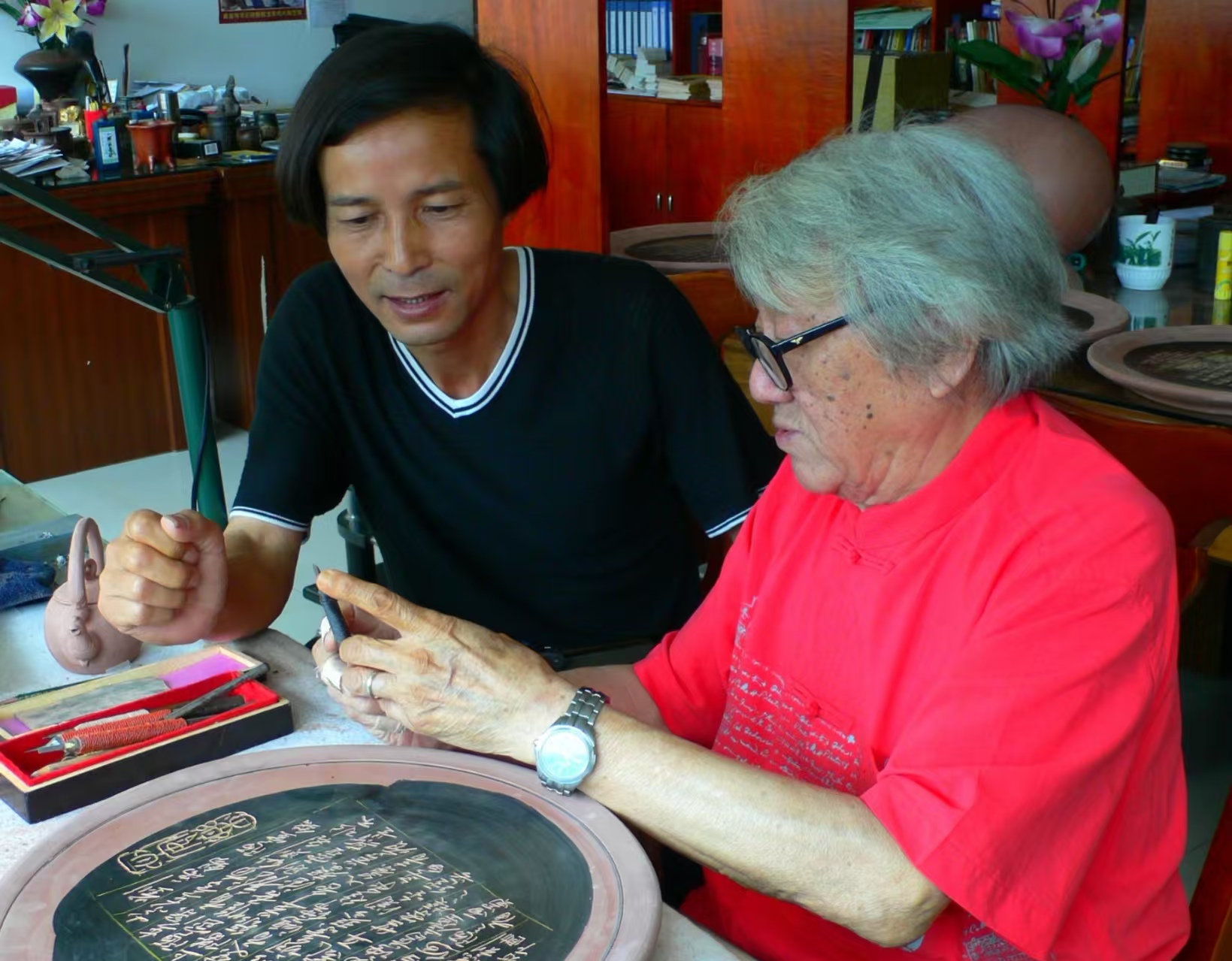 帅立志(右)早年传授梁剑锐(左)运刀之妙法