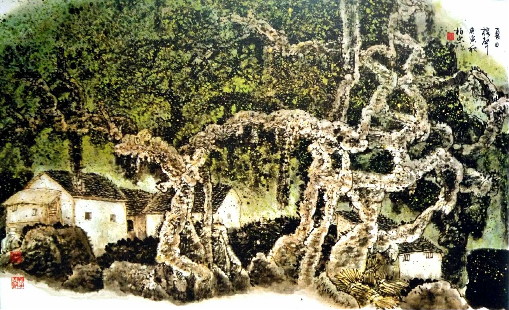 榕这种植物,在柏忠先生笔下形态各异,洋溢着浓浓的乡土气息。那略加夸张的造型风格柔合进一种梦幻般的意蕴和时代气息,体现了其拙朴而又空灵的精神境界。