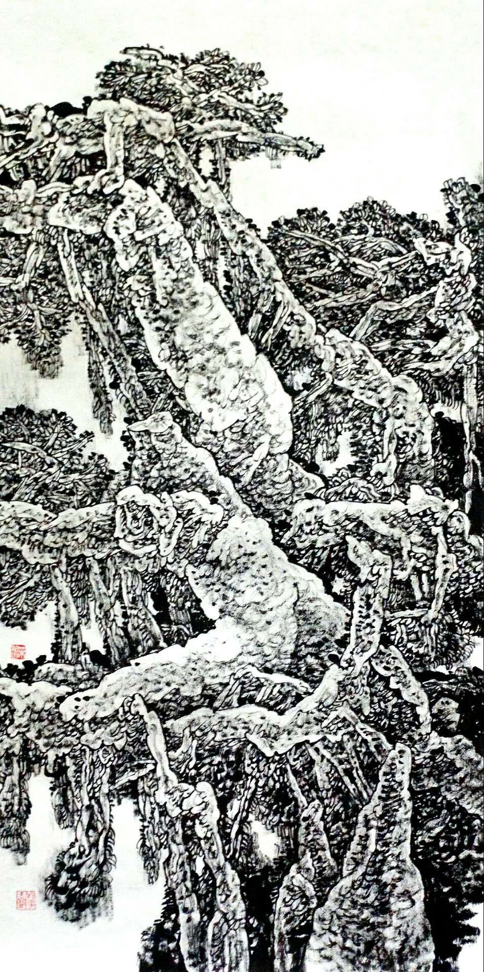 我以为,他的画作处处表达着坚实浑厚而不失空灵之气韵。那种组织、布局所勾勒出的粗细线条和墨彩意趣,给人以无限遐思。