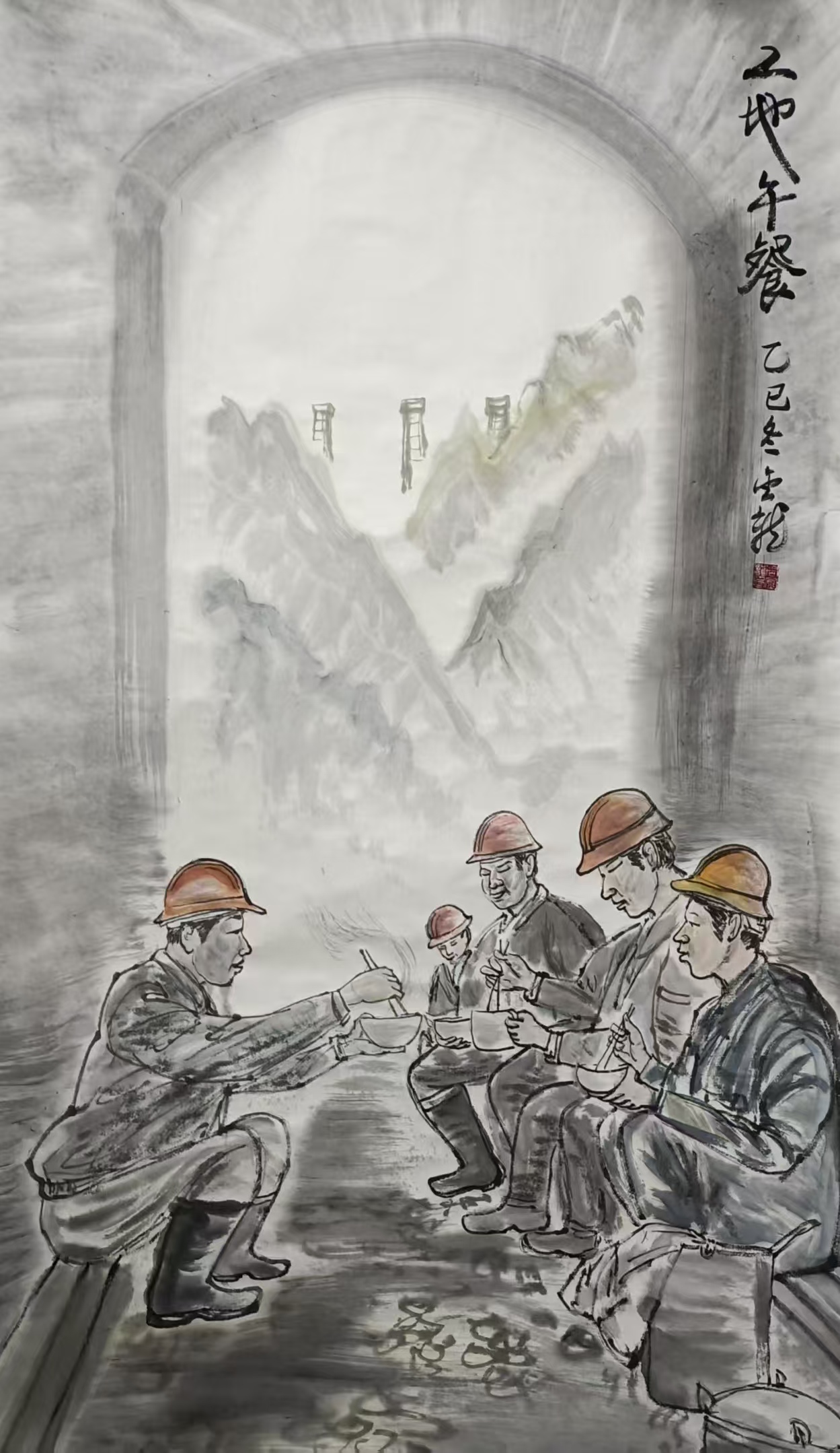 国画《工地午餐》67x130cm