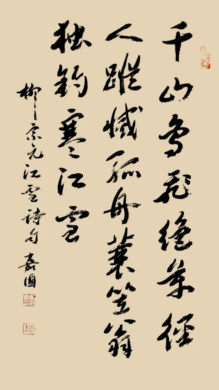行草 唐柳宗元.江雪:千山鸟飞绝,万径人踪灭。孤舟蓑笠翁,独钓寒江雪