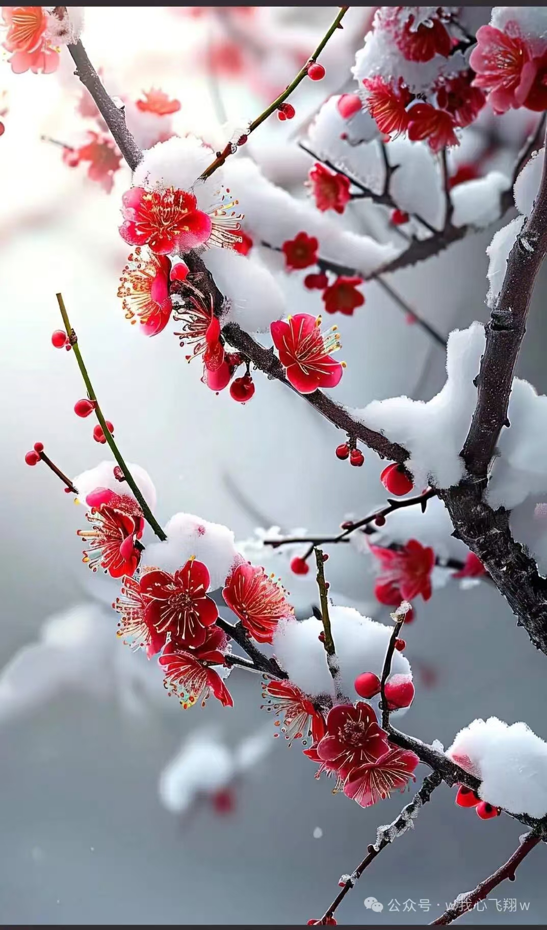 翻滚云低峭寒汇。梅朵开迎飞雪,
