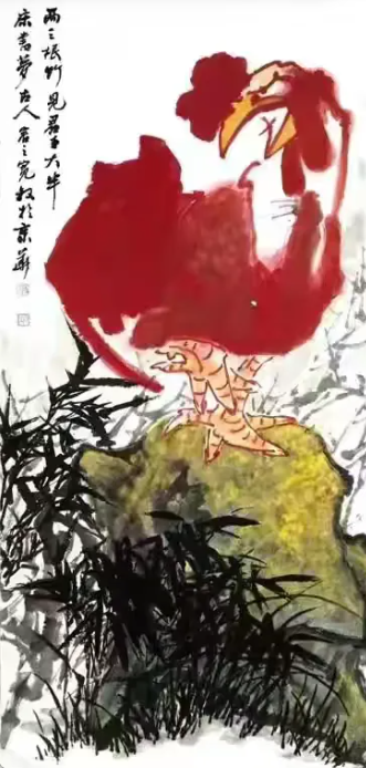 《韩诗外传》有言:“鸡有五德:首戴冠者,文也;足搏距者,武也;敌在前敢斗者,勇也;见食相呼者,仁也;守夜不失时者,信也。”尉明宽深契此理,遂将此伦理内化于笔墨之间。其所作百鸡千姿,或引颈长鸣以报晓,或护雏温饱以尽慈,或怒目待敌以显威,或群聚相呼以彰义。每一幅皆非简单摹形,而是借鸡喻人,托物言志,使观者在雄强笔力中感受正气,在泼墨重彩里体味深情。