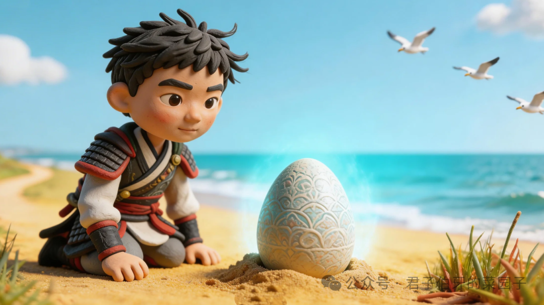 走着走着,脚下忽然被硬物一绊,小小勇踉跄着险些摔倒,连忙稳住身形低头细看——只见滚烫的沙地里,静静埋着一枚奇异的蛋,通体莹润剔透,泛着淡淡的淡蓝色光晕,在烈日下格外惹眼。