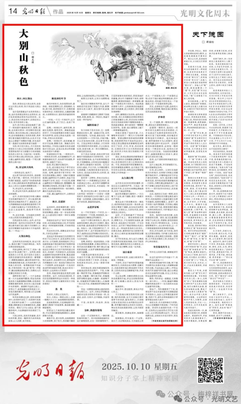 《大别山秋色》是一篇深情之作。它描绘了柿子、稻浪等丰收景象与红叶、白鹭等自然景致,生动呈现大别山秋日之美;同时礼赞乡亲劳作、新农夫耕耘、护林者坚守等场景,将红色历史、当下脱贫致富的生活与未来憧憬相融合,抒发了对故土与乡亲的深沉爱恋。