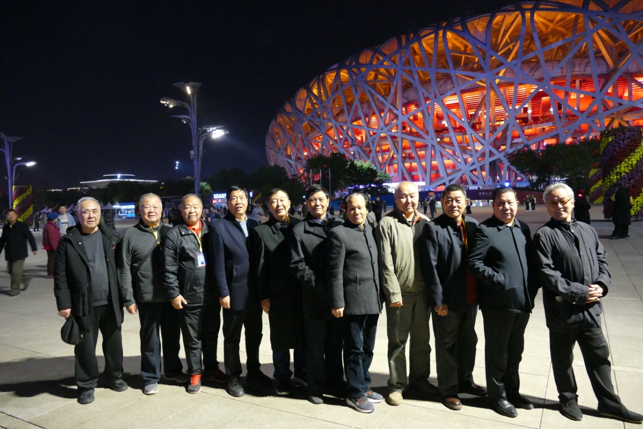 张衍海(左一)同铁道兵部分书画艺术家游览“鸟巢”合影