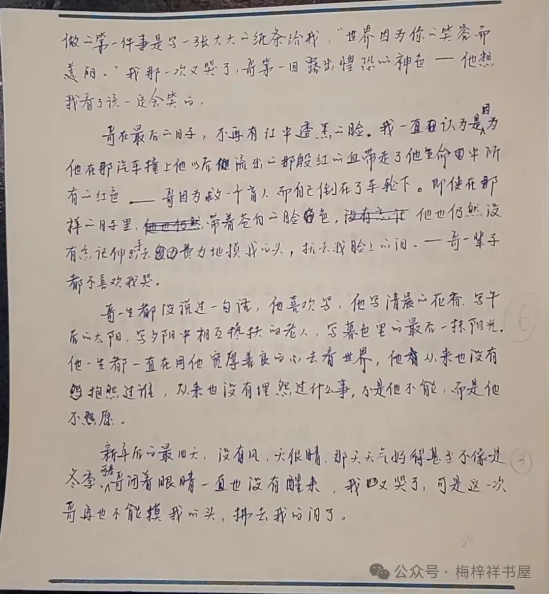 是在地摊一堆废纸中捡到的两页纸一一文章。哥哥“舍己救人”车祸身亡,手足情深,妹妹如泣如诉记述哥哥生前的点点滴滴,宽厚,善良,爱笑;形象生动,栩栩如生,令人爱怜。
