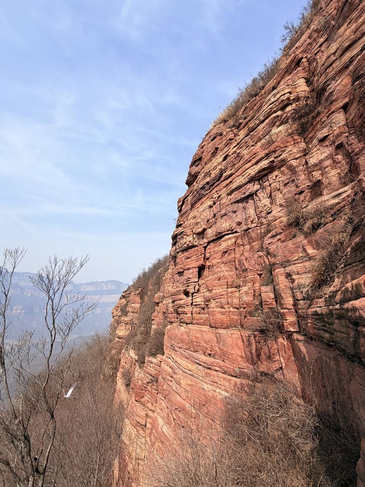 驱车驶入景区,最先撞入眼帘的,是那绵延不绝的赤色岩壁。亿万年的地质沉淀,将这片山峦雕琢成独有的模样,层层叠叠的丹崖如斧劈刀削,崖壁泛着温润的红,浅处是橘粉,深处是绛红,阳光洒落时,赤色光影层层漫开,像凝固的火焰,又像天地铺展的锦缎。民间自古流传,这满山丹红,是上古女娲炼石补天遗落的朱砂浸染而成,一崖一石,都藏着创世的神话。