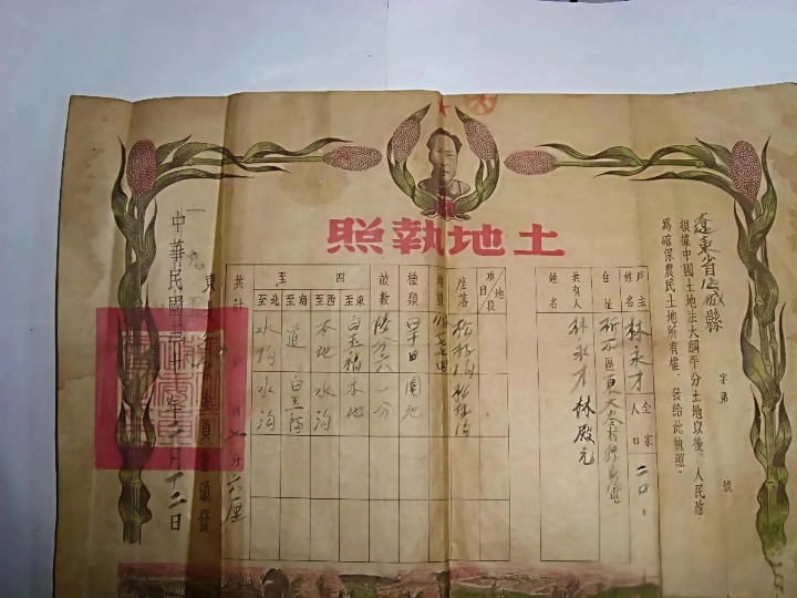 解放以后,特别令人终生难忘的是土地革命时期,农民朋友得到的那张祖祖辈辈梦寐以求的“土地证书”。他们用那高高的长长的角尺,丈量着田土,钉上那注有标记的木桩,张三,李四,王五等等,乡亲们就分到了这块土地。当那鲜红的“土地证书”送到脸上写满皱褶,满是老茧的农民手中,他们一个个老泪纵横,振臂高呼:“共产党万岁!毛主席万岁”!