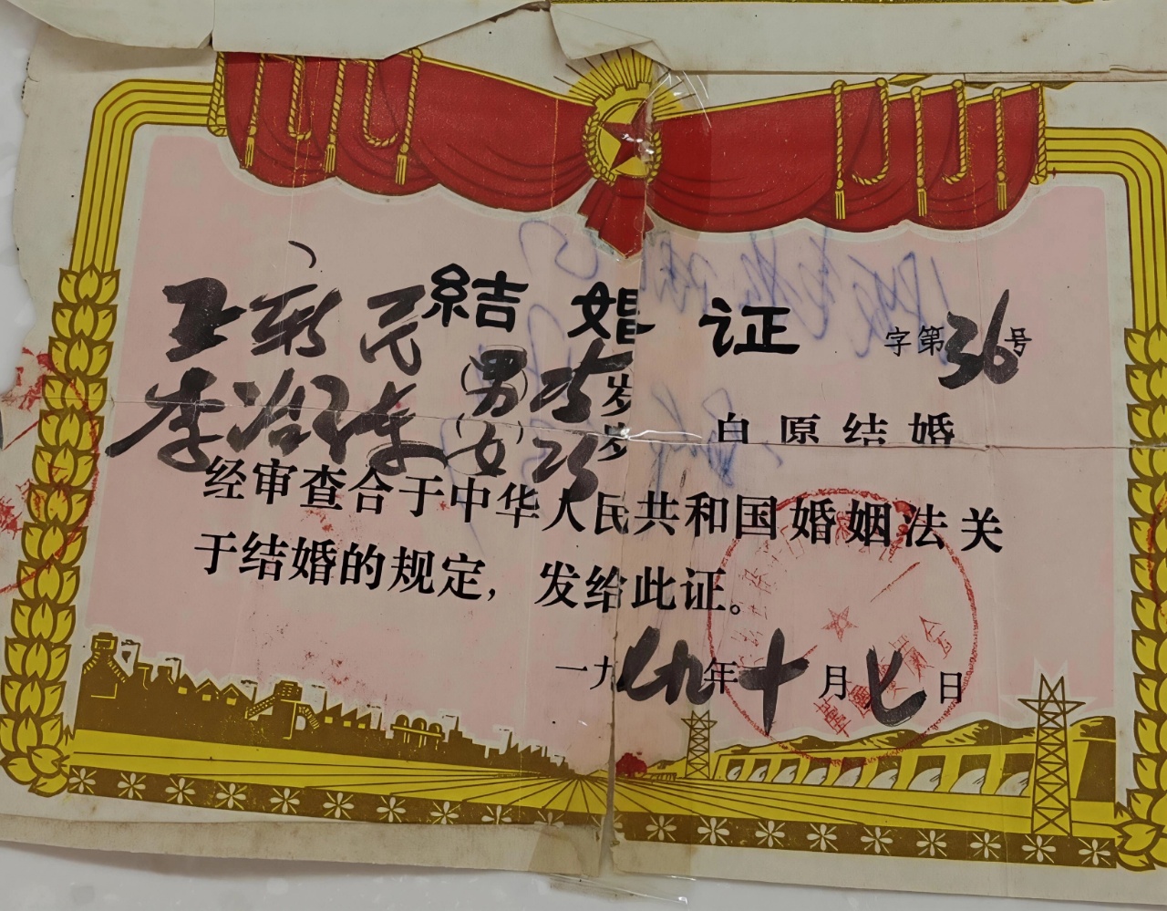 人生得到的第二类证书是“结婚证书”。那是1979年8月22日。我带着从新疆铁五师政治部干部部开的结婚证明,领着当时在直田中学教书的新娘子,去公社办公室打结婚证。记得当时的情景是这样的:那个办证的房子里有几个女同志,一看我们两个年轻人要进来,又看着我背了个军用挎包(里面装了些糖和瓜子)。就说:“你来办什么事?请进。”我说:“我们来打结婚证”。那她呢?当时娘子还有些羞涩,站在门外。我叫她进来,赶紧从军用挎包里拿出糖给她们吃。“喜糖!吃糖,吃喜糖”!没多大功夫,结婚证开完了。是两张小小的奖状一样的结婚证。从此以后,我俩的婚姻走遍天下都合法。