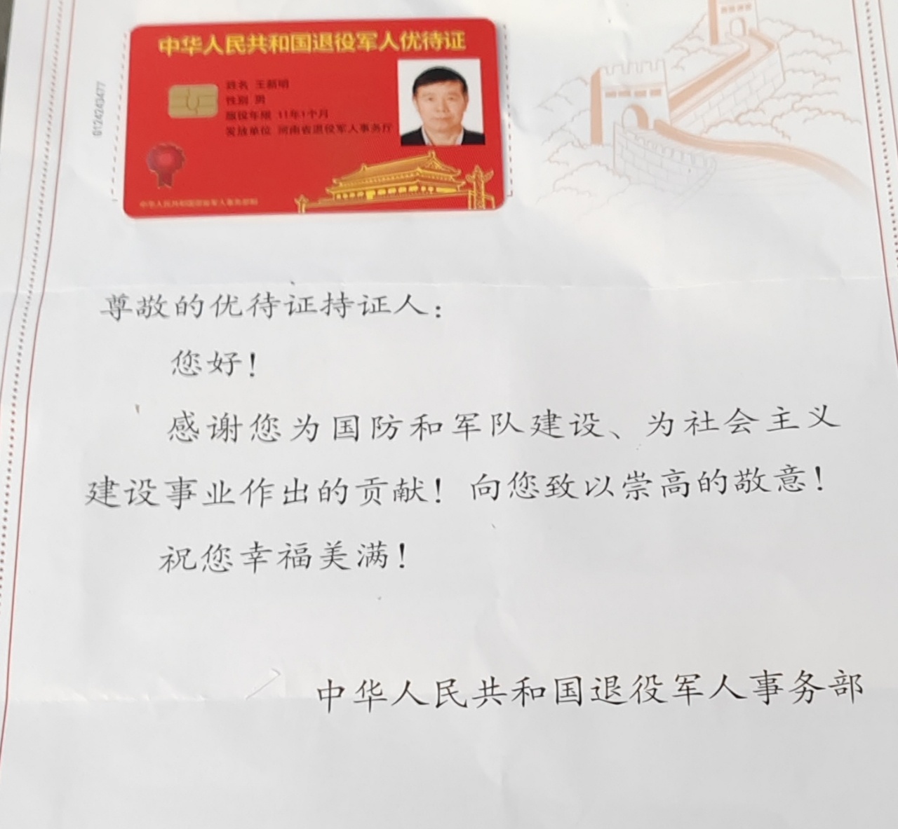 “退伍军人事务部”,给我们发的退伍优待证书,光彩夺目,具有一定“含金量”,让退伍老兵持军人优待证,免费游览祖国的大好河山,免费乘坐市内交通工具成为现实。因为军人舍家卫国,舍命保国,确实应该善待!应该优待!