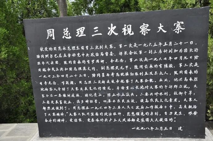全村土地不到八百亩,百分之九十挂在山梁、山嘴、山坡上,既不耐寒,也不耐涝。大寨党支部带领群众,不甘现状,直面困难,依靠集体的力量,征服了穷山恶水,大规模的改变了生产条件,从根本上改变了大寨的面貌。周总理生前曾三次视察大寨 。江青曾在大寨蹲点,生活居住多日。