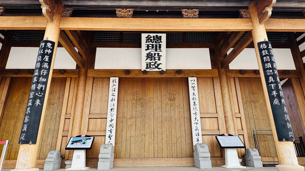 有这样两幅对联,均为沈葆桢撰写,最著名的一幅是在大门口的,“以一篑为始基,从古天下无难事致九译之新法,于今中国有圣人”,表示中国海防必须具备开放性、前瞻性精神,1866 年,左宗棠、沈葆桢在此以强烈的民族责任感,提出师夷长技以制夷的主张,创办了第一所海军学堂,并派出严复、邓世昌、詹天佑等优等生留洋深造,为近代海军输送众多人才,走出了第一批海军将领;创办福建船政,建起中国近代第一座造船厂,造出了第一艘铁甲舰,修筑了第一座西式炮台,改变了有海无防的被动局面,开启了中国近代海军与工业的觅梦之路。再看官署辕门口的另一幅对联,“且慢道见所未见,闻所未闻,即此格致关头,认真下手处何以能精益求精,密益求密,须从鬼神屋漏,仔细扪心来”,可见当年探求新事物的渴望态度与严谨要求,激励造船工匠勤奋进取,创新图强,这于新时代的今天仍然有着重要而深远的意义。