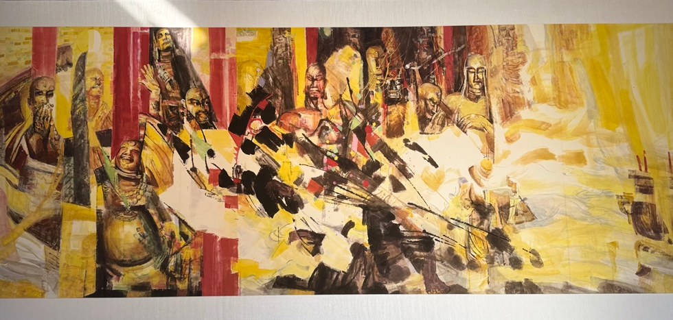 最吸引我的当是《石齐美术馆》,展出的画作所表现出的视觉冲击力,让我一时喘不过气来。石齐先生的作品色彩斑斓,风格独特,我竟然分不清他的画作是国画,还是油画,他以独特的大画风艺术视角,將具象、印象与抽象三者融合,开拓性地提出了“三象合一”的艺术理论,具有强烈的个人特色和创新精神。馆中还设有一放映室,我进去时正在播放石齐访谈录,里面还坐着俩孩子,听口音像是从北京来的,他们一边看一边说,感觉他们对石齐的画作比较熟悉,而且对画家也很了解。