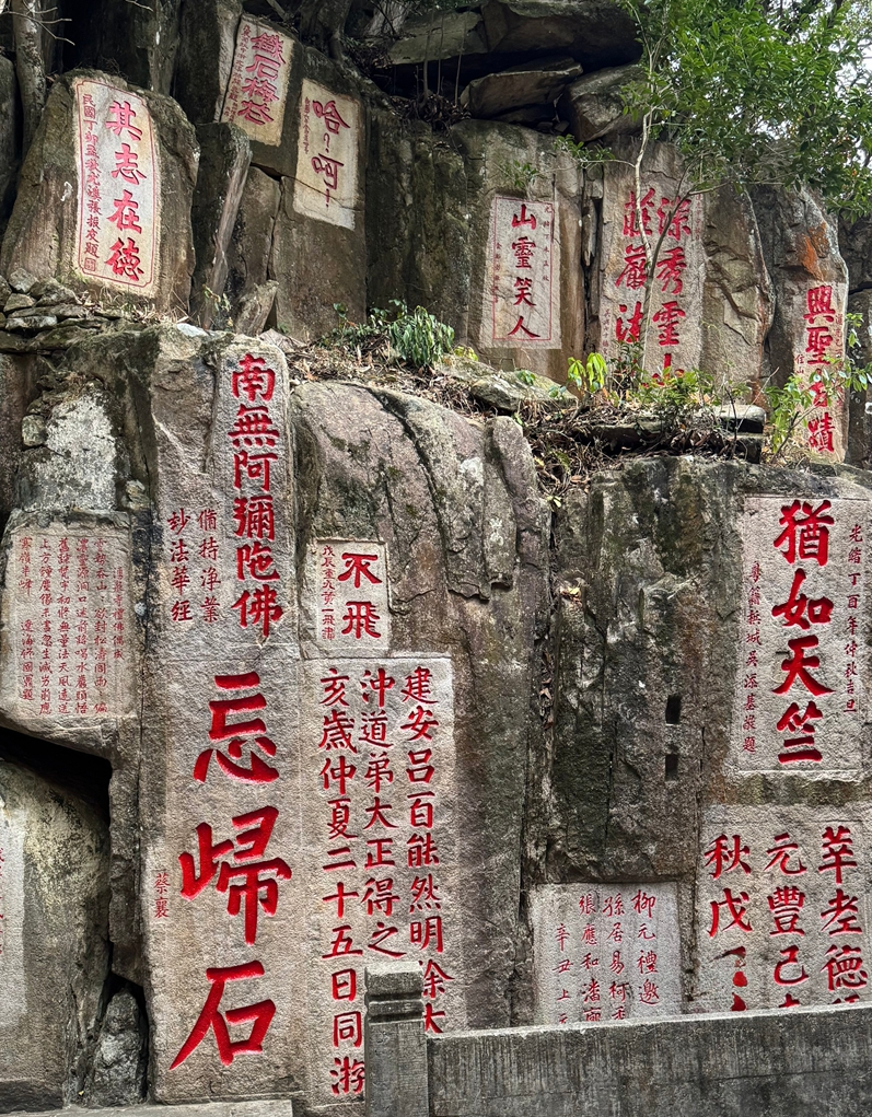 登上山间古道,看见稀疏的石刻在道旁排列,数了一下共有十七方,心中不禁发笑,太小题大做了,这还能誉为“东南碑林”?来到灵源洞与喝水岩旁,真的让我瞠目结舌,六百多方摩崖石刻遍布崖壁。蔡襄的 “忘归石”,朱熹的巨幅 “寿” 字,李纲、郭沫若的题咏,篆隶楷行草诸体皆备,千年书法艺术在此汇聚。顺道而上,古木参天,清泉潺潺,石刻为伴,禅音入耳,尘世的喧嚣尽数消散。鼓山用苍翠与宁静,守护着福州的诗意与从容。