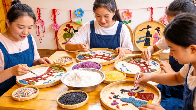 是的,星河。你若凝神看去,便会发觉,那不是在作画,那是在用最谦卑的材料,搬运着胸中的宇宙。老艺人的指尖起落之间,素白的绢上,便渐渐有了形貌。那用黑米与褐米点染出的,是水牛温驯的脊背,一粒米便是一个墨点,连起来便是它憨厚而有力的轮廓;那用黄米与绿米交错铺排的,是层叠的梯田,色彩的过渡全靠米粒的疏密来表现,远山则用极淡的、间杂着灰白的米粒轻轻晕开,仿佛有岚气正在升起;最惊人的是那幅《龙凤呈祥》,金黄的米粒盘成威严又慈祥的龙身,朱红的米粒叠出华美而飞扬的凤尾,龙鳞与凤羽的纹理,全靠米粒尖端那一点细微的方向变化来呈现,栩栩如生,仿佛下一刻便要破绢而出,直上云霄。