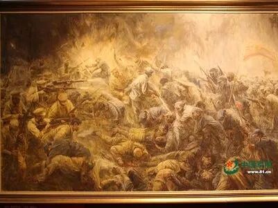 《鏖战独树镇》:这幅画作描绘了红 25 军长征中在独树镇与敌军展开激烈战斗的场景,画面上方举刀挥向敌人的战士,构成了远景人物的高点,近景中负伤卧倒的战士们,则展现出战斗的惨烈。