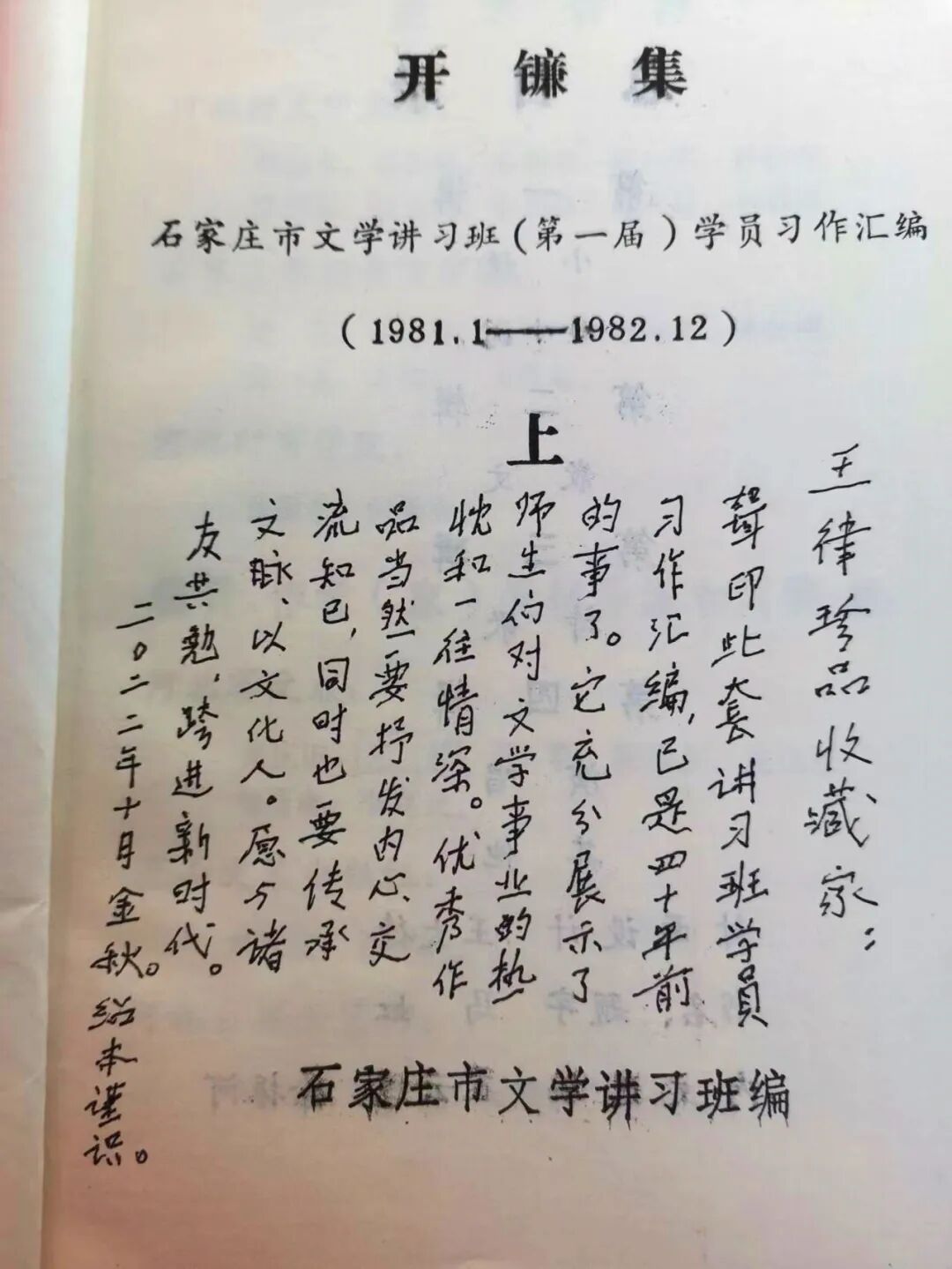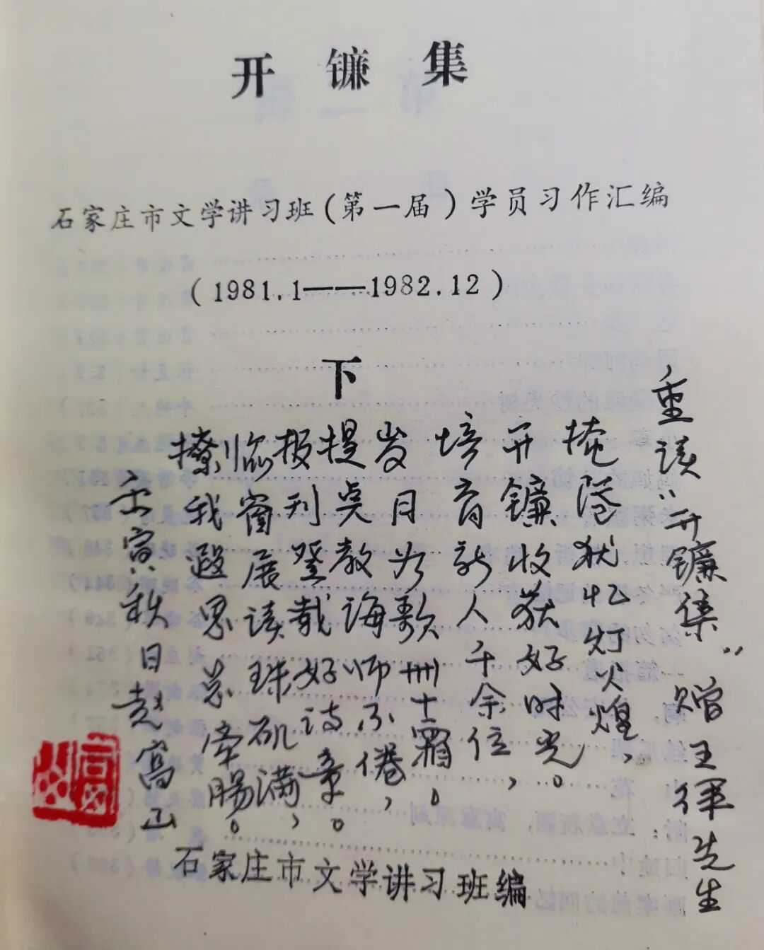 今天重新看到资深记者、红色收藏家王律先生的藏品《开镰集》,这是40年前石家庄文学讲习班编印的讲习班第一届学员习作并在各级刊物公开发表的文学作品汇编。作品跨度从1981年初到1982年底两年时间。那时石家庄市总工会和市文联联合举办了三届工人文学讲习班,非学历业余教育,由省市大专院校的中文系老师任教,培养文学作者千余人。