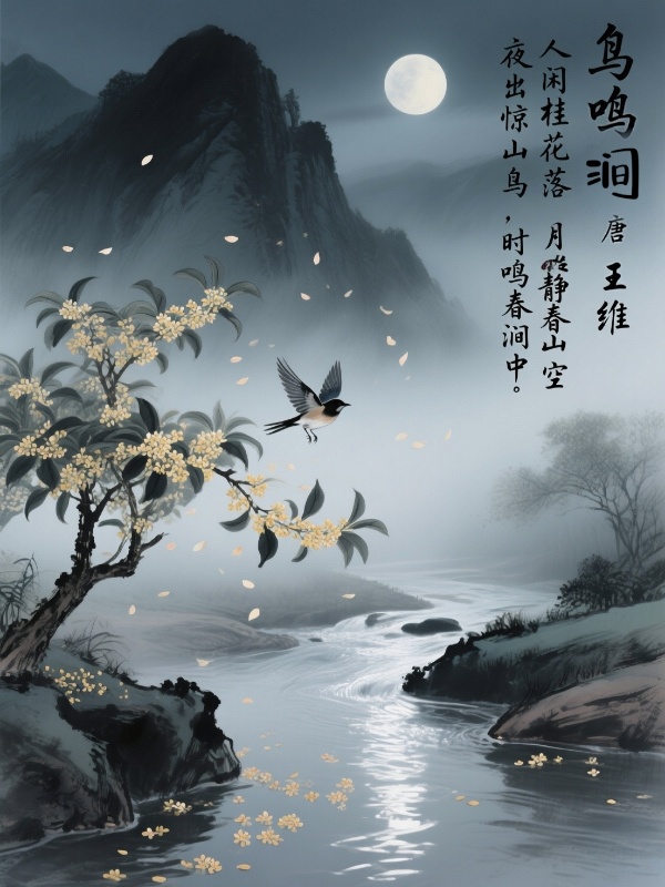 山涧潺潺,鸟鸣声声,月光如水,桂花飘落,所有意象融合成一幅月夜春山图。画面以素色为主,桂花的淡、月光的白、山林的青,色调清雅,不染尘俗,恰合禅意“清净无为”的审美追求。没有浓墨重彩,没有繁复勾勒,仅以寥寥数笔,便勾勒出山水的神韵。苏轼曾评价王维:“味摩诘之诗,诗中有画;观摩诘之画,画中有诗。”在这首诗中也得到完美的体现。