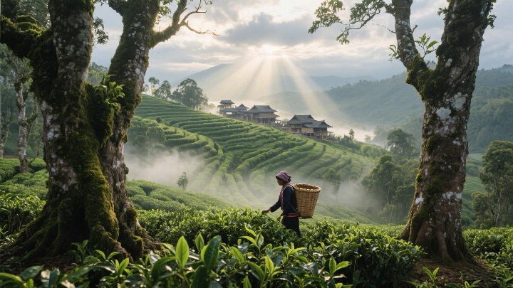 在滇西南绵延跌宕的层峦深褶之中,景迈山静卧如一枚被亘古时光精心打磨的翡翠,莹润含光,悬浮于浩渺云海的波峰浪谷之上。此地,是北回归线途经之处最后一片未经尘嚣浸染的绿洲秘境,是千年万亩原生古茶林与布朗族、傣族古老寨落相依相生、互为血脉的生命图腾。当破晓时分的第一缕曦光刺透厚重云帷,沉睡的古老寨影于乳白晨雾中渐次苏醒,与山峦沟壑间氤氲流转的茶香——那无形无质却又永恒不灭的茶魂,默然开启又一轮跨越千载时光的静峙与凝望。