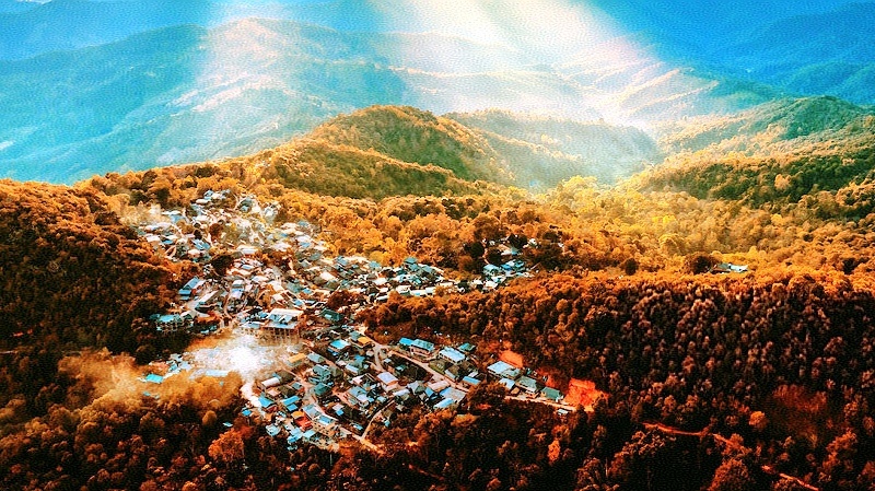 翁基、糯岗……这些烙印着布朗族与傣族血脉记忆的寨名,宛若散落于陡峭山脊线上的古老琴键,每一次被山风叩响,便流淌出沧桑的岁月回音。它们绝非矫饰取悦的“景观”,而是时间之刃与生存意志共同镌刻于大地之上的粗粝史诗。干栏式木构吊脚楼群落,依循山体天然肌理次第攀升,错落层叠如大地的阶梯。深褐色木墙体饱浸百年疾风骤雨的洗礼,在高原炽烈的日光下浮泛温润微光;青灰色瓦片覆顶,苔痕斑驳如青铜锈迹,在层递的屋面铺展成凝固的墨绿浪涛。寨心广场中央,历经风霜剥蚀的缅寺佛塔或图腾寨心桩肃穆伫立——它们是寨影搏动的心脏,每一次静默的呼吸都震颤着信仰的脉律与族群秩序的基石。