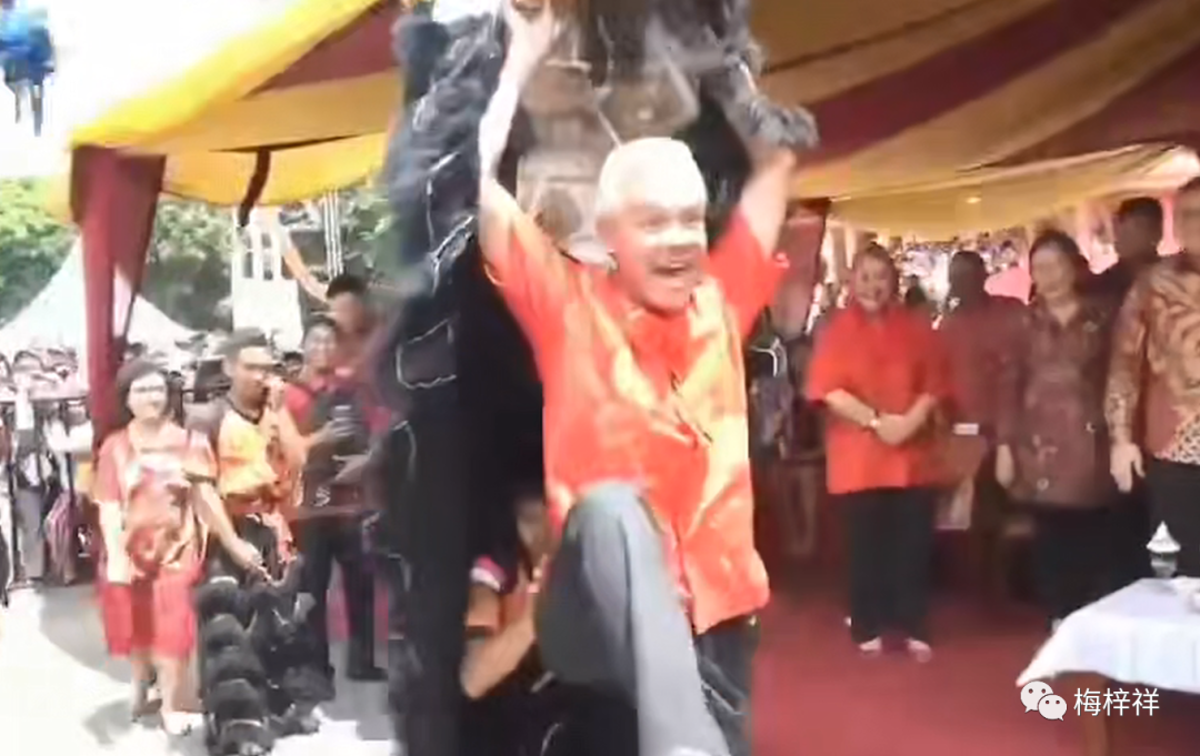 朋友苟皓东在朋友圈发了一个视频:印度尼西亚中爪哇省省长甘吉尔舞狮子。