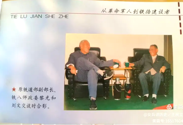 原铁道部副部长、铁路工程部队第八师政委黎光与原太原铁路局局长、铁路工程部队第八师参谋长刘文合影。