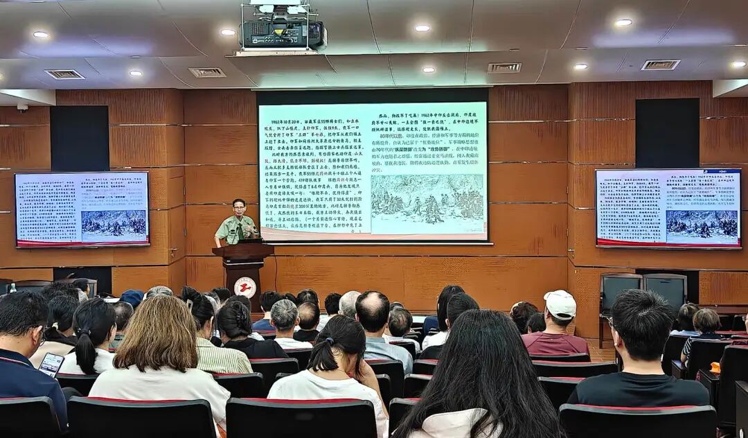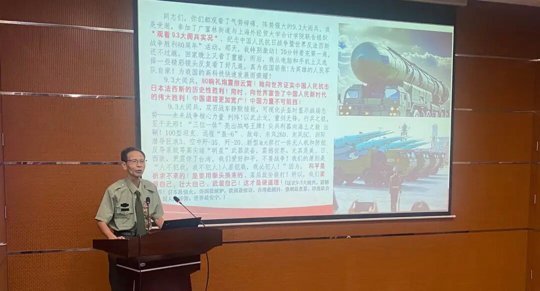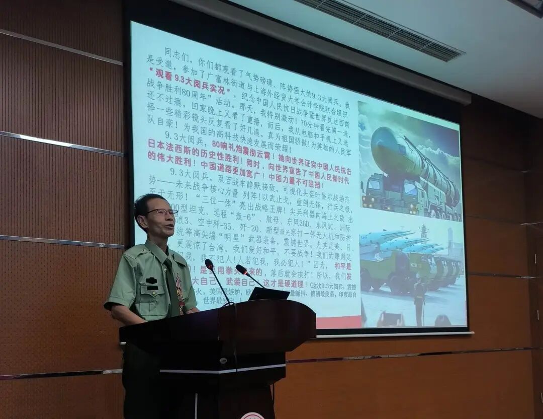 胡老师结合学院的科研成果,讲述了我国这次大阅兵。"9.3大阅兵"后,世界各国皆受到巨大震憾:有的为之骄傲自豪,有的为之欢心庆贺,也有的嫉妒胆颤,其中印度内心是最为酸楚的。胡老师介绍了1962年中印自卫反击战后,60多年来印度侵占我国的贼心不死,在中印边境多次挑衅滋事,企图继续蚕食我国领土,但结果都落得个“灰头土脸”的结果,都以失败告终。胡囯征老师以亲身经历的非公开性87反击战为例,用铁的事实表明:中国领土神圣不可侵犯,揭露了印度这种口头上自嗨而内心深处自卑的矛盾心理。