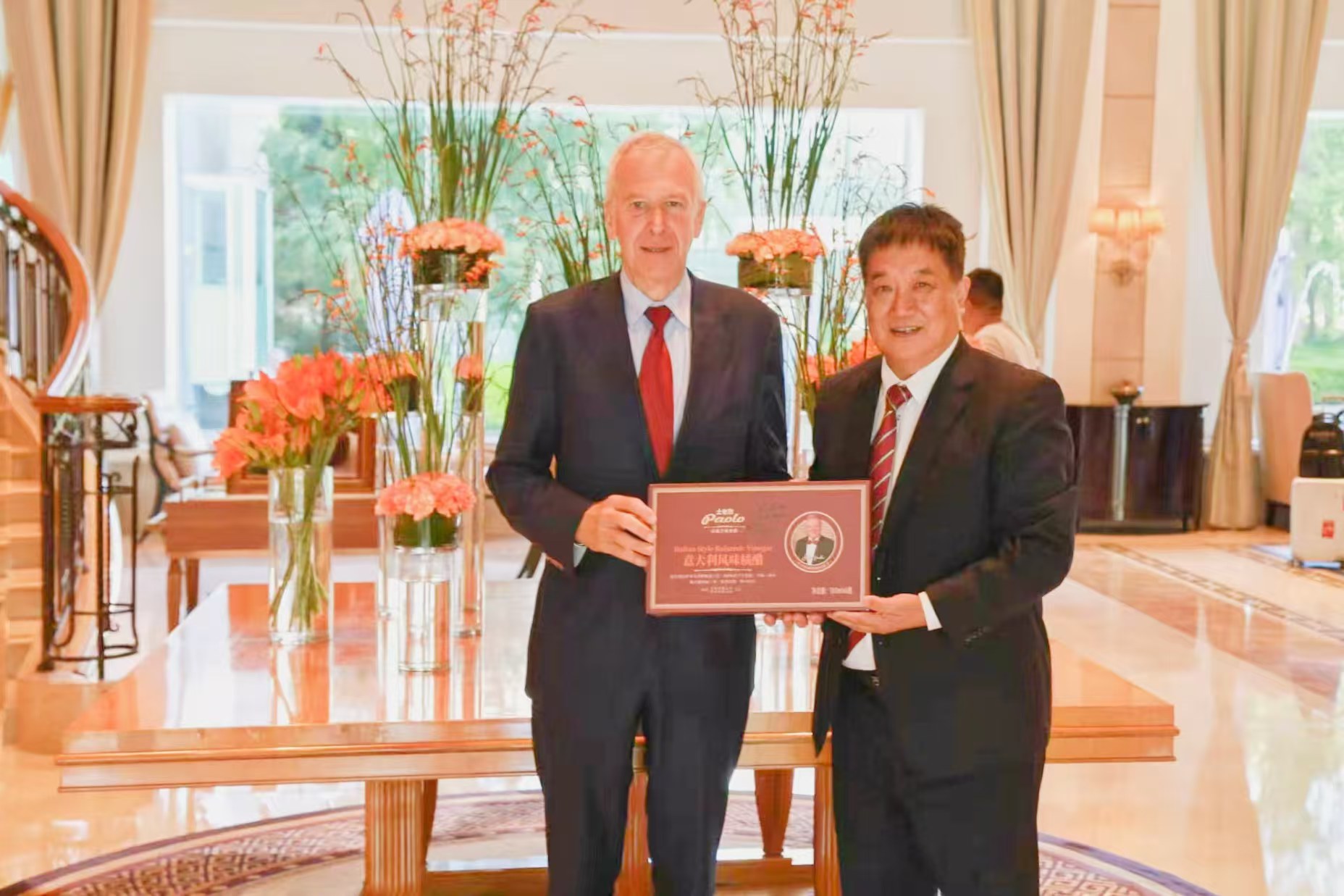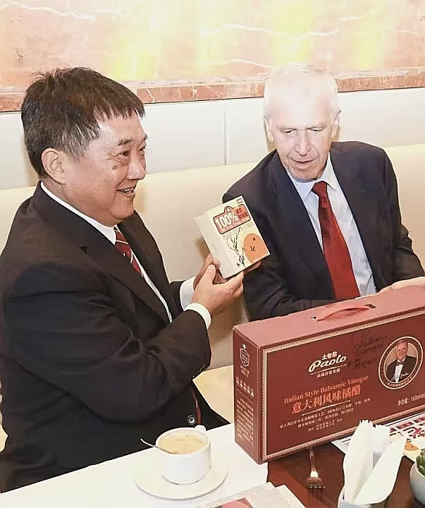 谈及意大利风味橘醋的研发,陈世贵特别介绍了意大利摩德纳大学教授保罗·朱迪西的技术支持。保罗教授凭借其卓越的专业知识和丰富的经验,将世界第一大水果酿造成健康美味的橘醋,为中欧文化交流搭建了一座坚实的桥梁。莱特姆在包装上签名留念,并与陈世贵合影,那温馨的瞬间被定格在照片中,象征着两国友谊的深厚与长久。