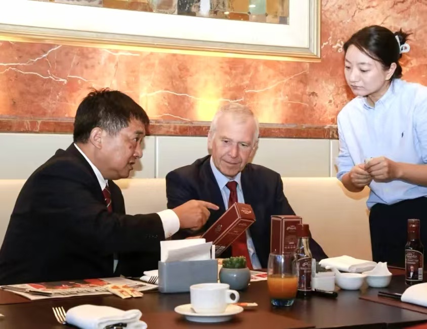9月6日,欧洲理事会前主席、比利时前首相伊夫·莱特姆在北京与土老憨集团董事长陈世贵展开了一场意义深远的会谈。现场氛围温馨雅致,宛如一幅宁静而优美的画卷。莱特姆对“柑橘酿醋”这一独特的创意表现出了浓厚的兴趣,眼中闪烁着惊喜的光芒,仿佛发现了一片新的文化宝藏。他品尝橘醋后,连连称赞“味道极佳”,并迫不及待地追问研发初衷。陈世贵娓娓道来,讲述了三峡地区丰富的柑橘资源,以及20年来土老憨人攻坚克难、砥砺前行的奋斗历程,最终酿造出填补中国果醋空白的橘醋。如今,土老憨的产品已拓展至多个系列,出口俄罗斯、澳大利亚、西班牙等多个国家,成为中国酿造文化的一张亮丽名片,向世界展示着中国酿造的智慧与魅力。
