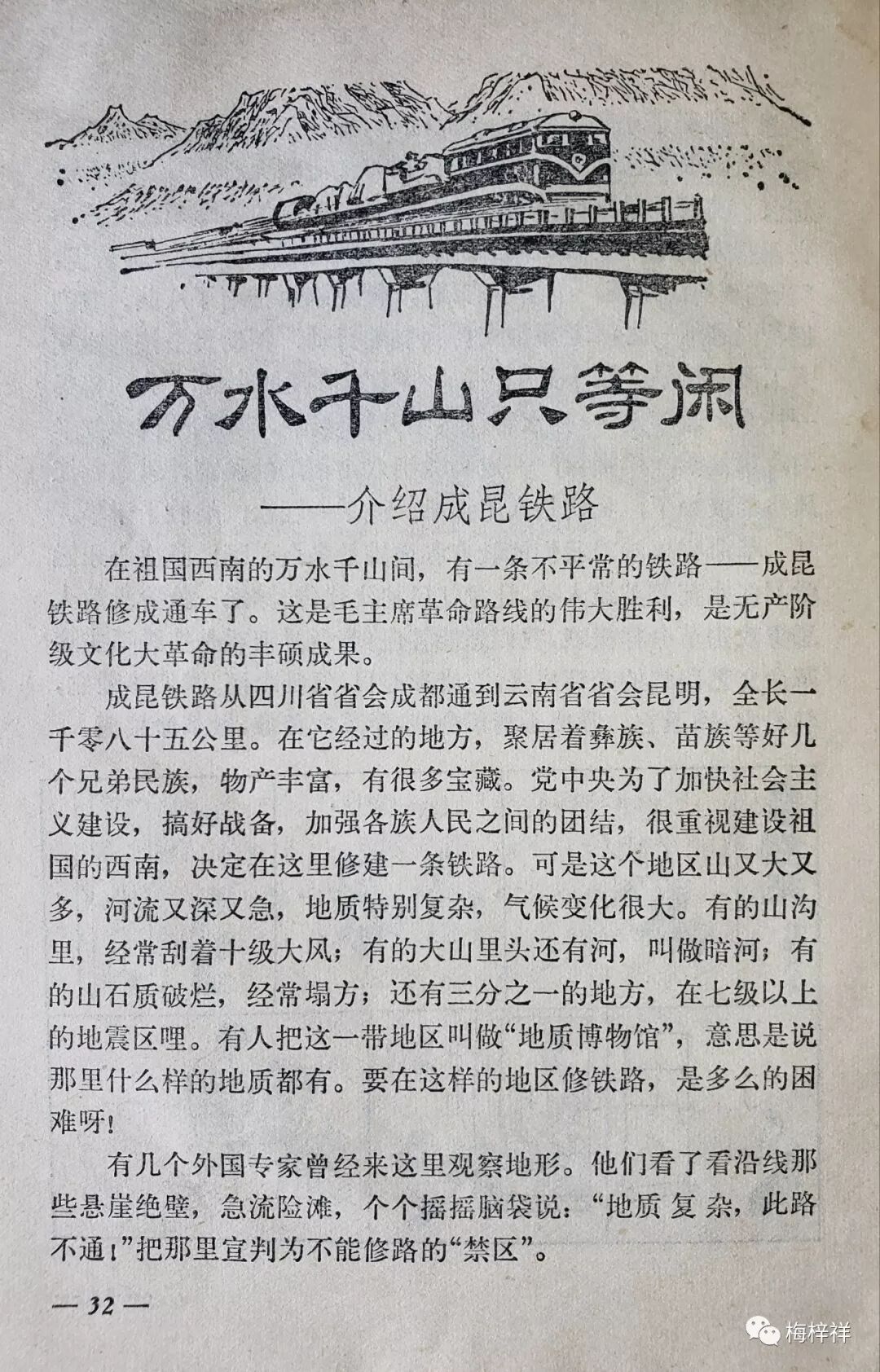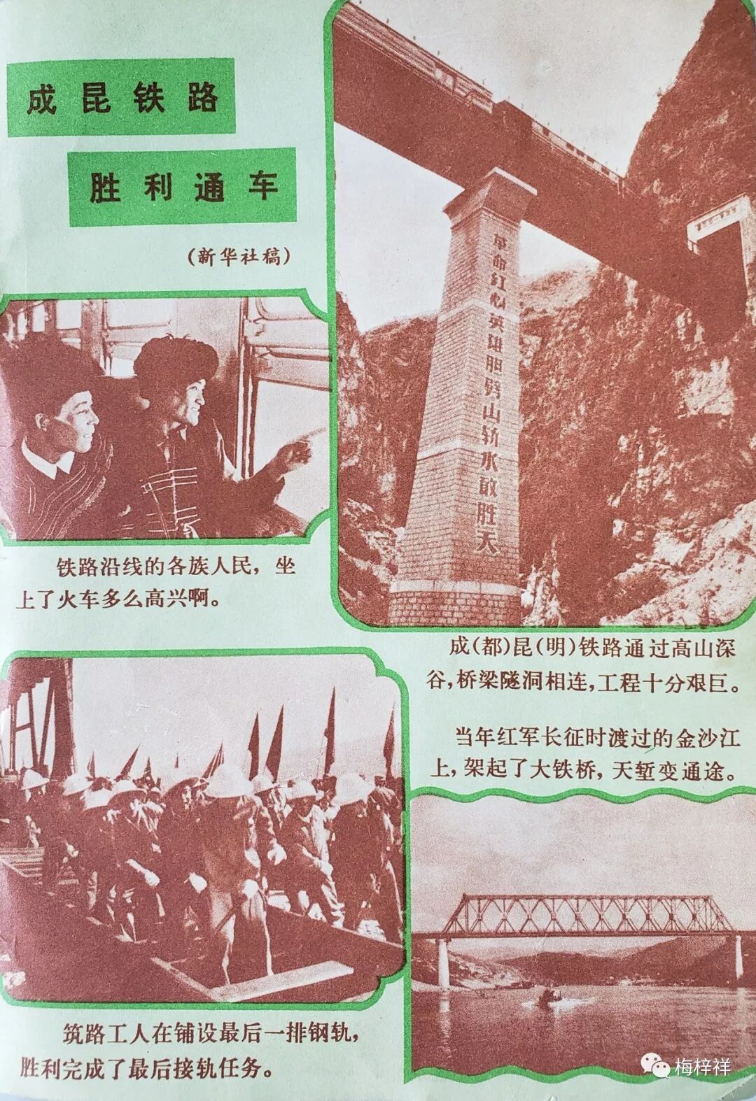 像这样艰巨的工程,在世界铁路建设的历史上都是少见的。但是英雄的筑路大军,为了同帝修反争时间,冲破千难万险,提前完工修成,在一九七○年党的生日那天正式通车了。过去,从成都到昆明只能乘汽车,一趟还要花十来天,现在不到两天就可以到达。祖国各地和西南边疆之间的距离,由于这条铁路的建成通车,大大缩短了。