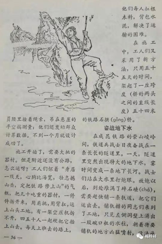 无产阶级文化大革命的熊熊烈火,锻炼了筑路大军的革命精神。他们愤怒批判了修正主义路线,坚决贯彻“鼓足干劲,力争上游,多快好省地建设社会主义”的总路线,披荆斩棘, 排除万难,铁路飞快地向前伸展。它,飞渡大渡河,横跨金沙江,穿过大、小凉山。这些都是毛主席率领工农红军长征经过的地方。筑路大军继承老红军的革命传统,以“红军不怕远征难,万水千山只等闲”的英雄气概,凿通了几百座大山,在大山里修了四百二十七座走火车的隧道:在江河山谷上架了六百五十三座桥梁。修隧道时,遇到石质破烂的山,要加强支撑,把它稳固起来;遇到山里面有暗河,要想法在隧道里再架桥。成昆铁路全线的桥梁和隧道,加起来有四百多公里长,相当于修二十条从天安门到颐和园的地下铁道和空中走廊。由于沿线平地太少,许多地方找不到修车站的平地,就有三十四个车站只好修在山峒里边和桥梁上面。
