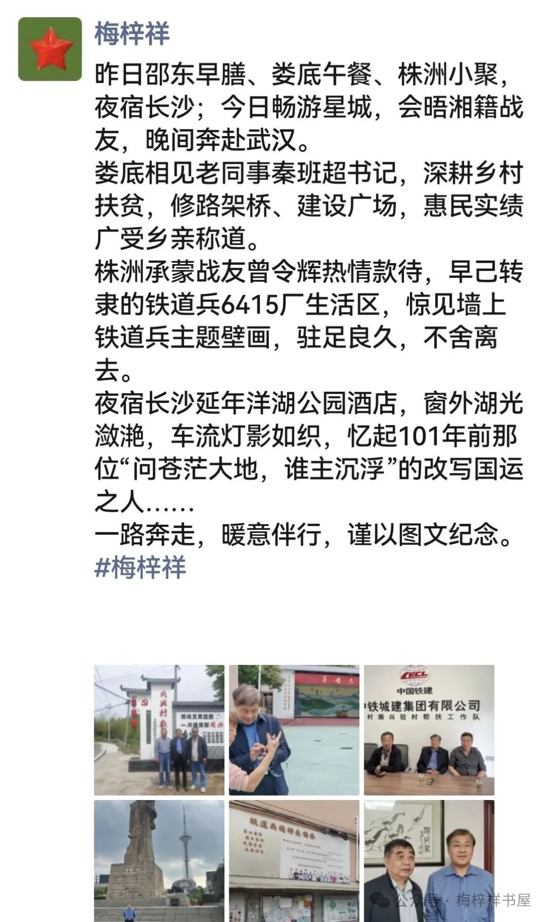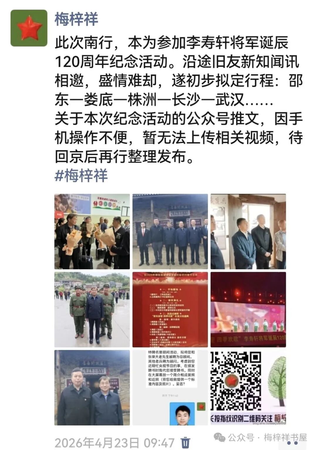 4月21日,我自北京启程,赴湖南邵东参加铁道兵司令员李寿轩将军诞辰120周年纪念活动。循着铁道兵的红色血脉与战友深情,一路行经邵东、娄底、株洲、长沙、武汉,历时六天,于26日返京。一路所见、所闻、所感,皆铭刻于心,既缅怀这位铁道兵元勋的光辉一生,也感念战友相知、相守之暖,遂撰文以记之。