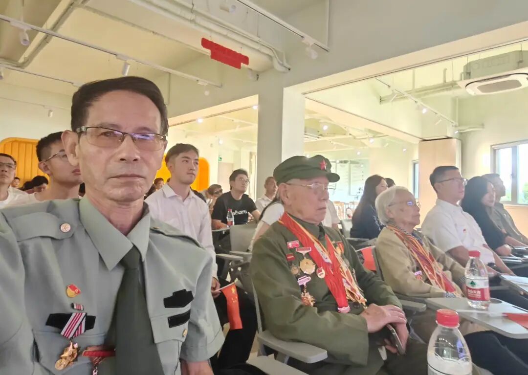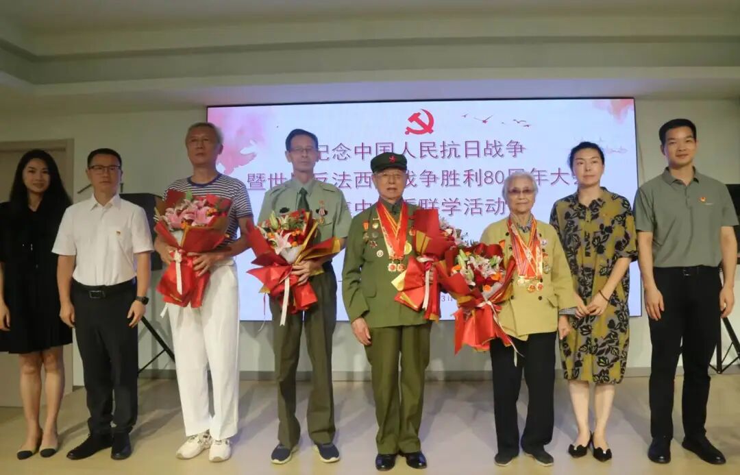 就在同一天,老兵团的胡国征老师受西子湾小区居委会党支部徐书记邀请,参加了广富林街道与共建单位上海外经贸大学会计学院联合开展的”观看9.3大阅兵实况暨纪念反法西斯抗战胜利80周年纪念活动。这次活动一共邀请了4位老兵(1位抗美援朝老兵,1位解放战争时期老兵,还有就是老兵团的胡老师和另1位老兵)。阅兵结束后,街道党委书和黄书记给4位老兵敬献了鲜花,并合影留念。同一天参加活动的还有老兵讲故事宣讲团的李学武和潘银弟老师,他们同时作为茸耀五老代表,在松江区老干局观看大阅兵纪念活动。他们表示:看到今天的阅兵盛况,抚今追昔,激动和自豪之情无以言表。伟大的抗战精神是中华民族伟大复兴的基石,鼓舞着中国人民奋发图强,砥砺前行!