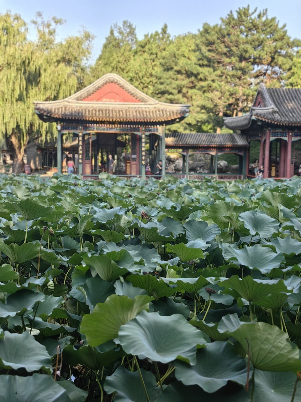 池水中的主角当数茂盛翠绿的莲荷,她们亭亭玉立,硕大的伞状绿叶支撑起一片片碧蓝的天。在文人的笔下荣获无尽的美誉,“芙蓉”“菡萏”的美名专指六月盛花期浓妍光灿的丽影,美妙动人的色彩无与伦比。王昌龄有诗句赞美“芙蓉向脸两边开”,表达诗人赏荷时眷恋的场景与心底的爱慕之意。“芙蕖”也是诗人笔下对莲荷的雅称,苏东坡词句“一朵芙蕖开过,尚盈盈”也是予她美丽如仙、轻盈姿态的赞许。更有甚者,古代文人的诗篇中对其作了人性化的处理,常常喻其为“水宫仙子”、“芙蓉仙子”和“仙女”的美称。眼前池中翠绿如洗的莲荷无疑是“谐趣园”景色中不可或缺的重要元素。